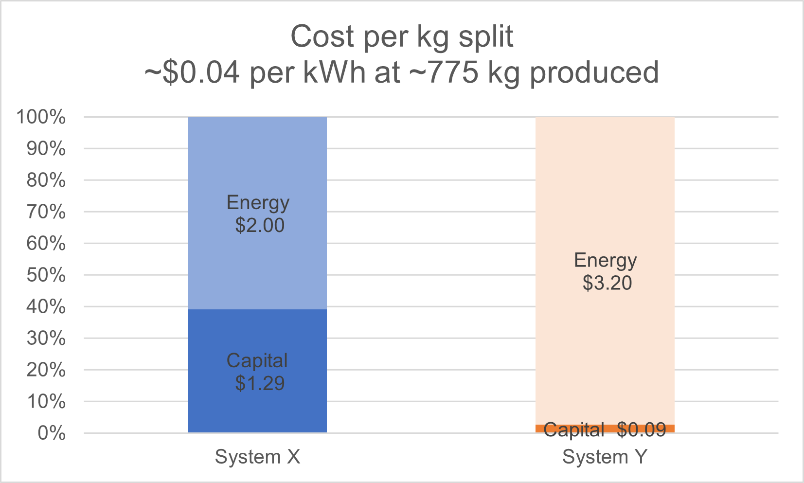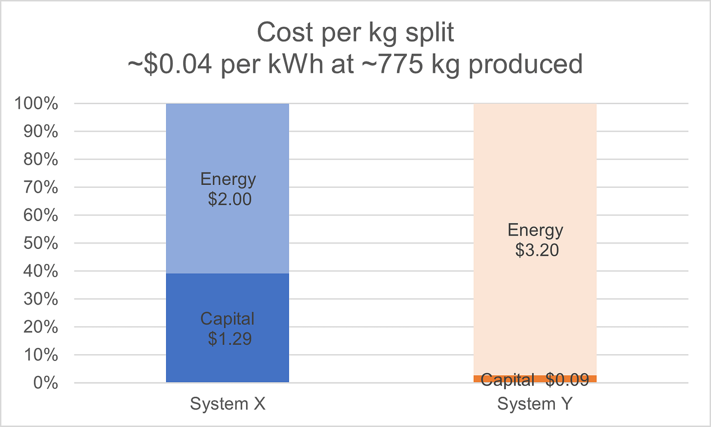 Y only requires ~$70 in equipment spend per kW, but needs ~80 kWh to produce a kg of H2.