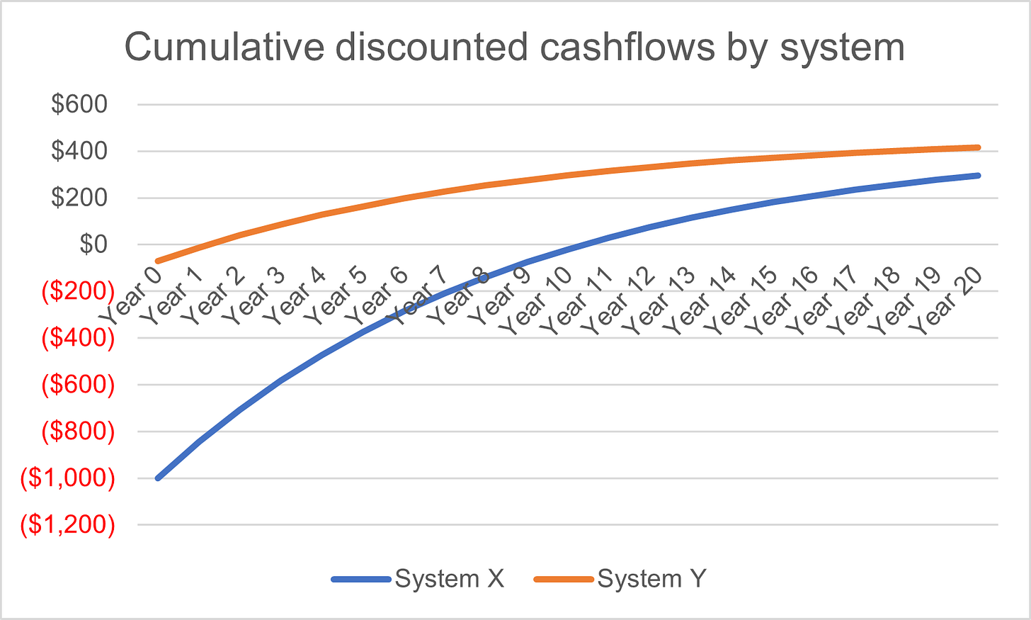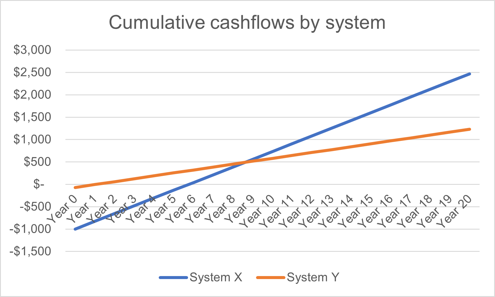 I’ve not included the effect of discount / hurdle rates in any of these calculations. To the extent these are factored in, it would make System Y look more appealing (all else equal) because its higher energy costs happen over time versus System X’s higher upfront costs.