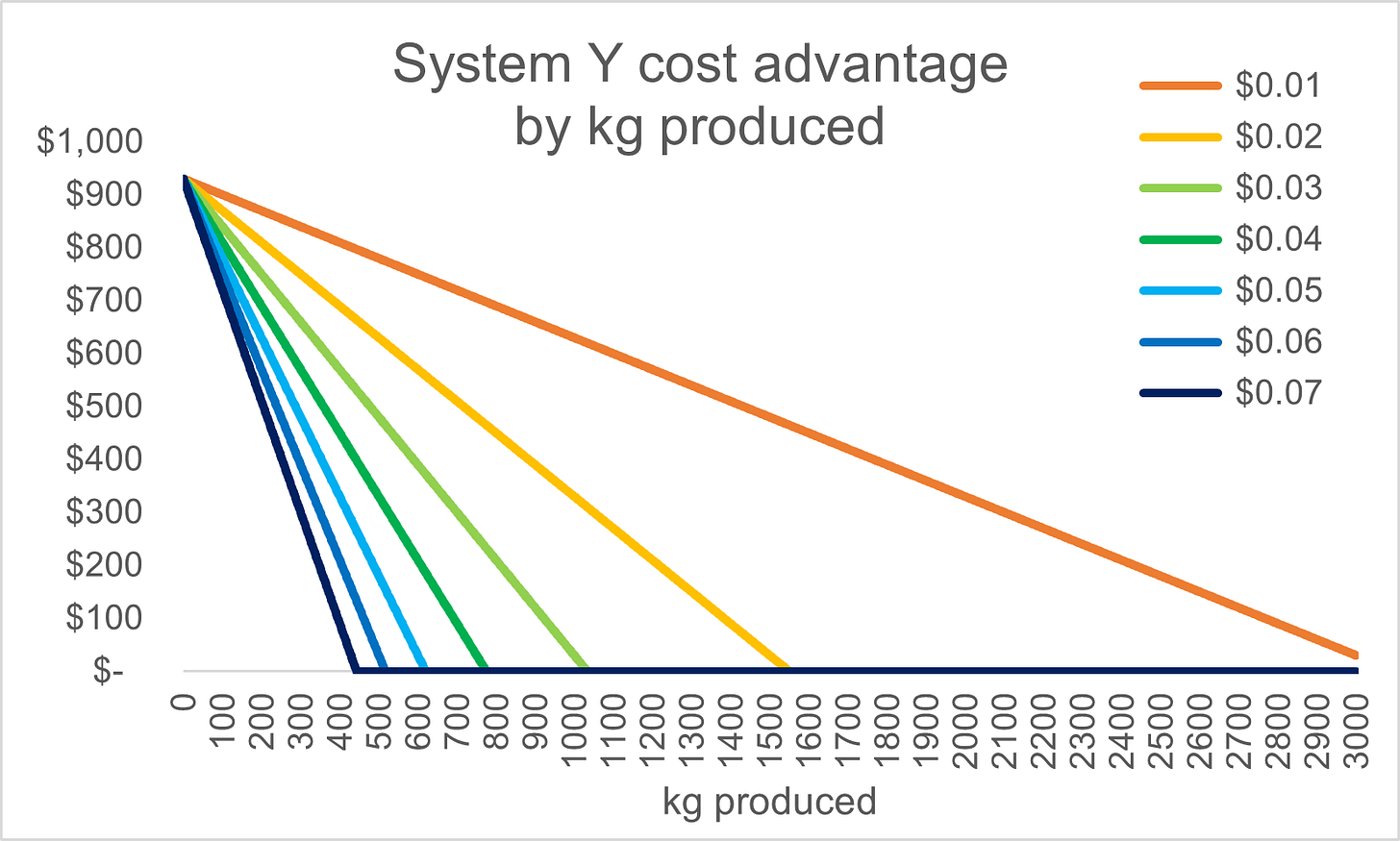 Thereafter, System X would be producing power more cost effectively at ~$2.00 per kg in energy costs versus system Y’s ~$3.20 in energy costs.