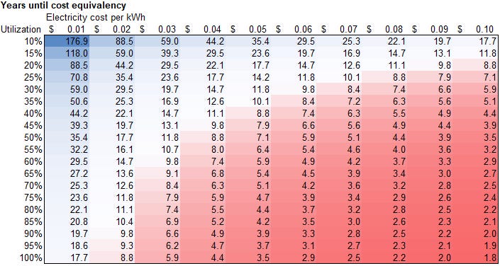 In the below, we see the # of years5 for costs to equalize based on potential utilization % and cost per kWh, with the red cells indicating shorter timelines (system A wins faster) and blue cells indicating longer timelines.